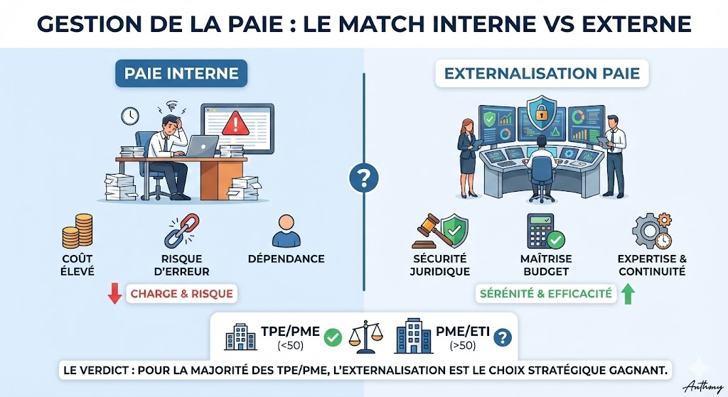 - Pour les TPE/PME (jusqu’à 50 salariés) : L’externalisation est quasi systématiquement la solution la plus sûre, la plus simple et la plus rentable. Le risque et le coût d’une gestion interne sont trop élevés par rapport aux bénéfices.